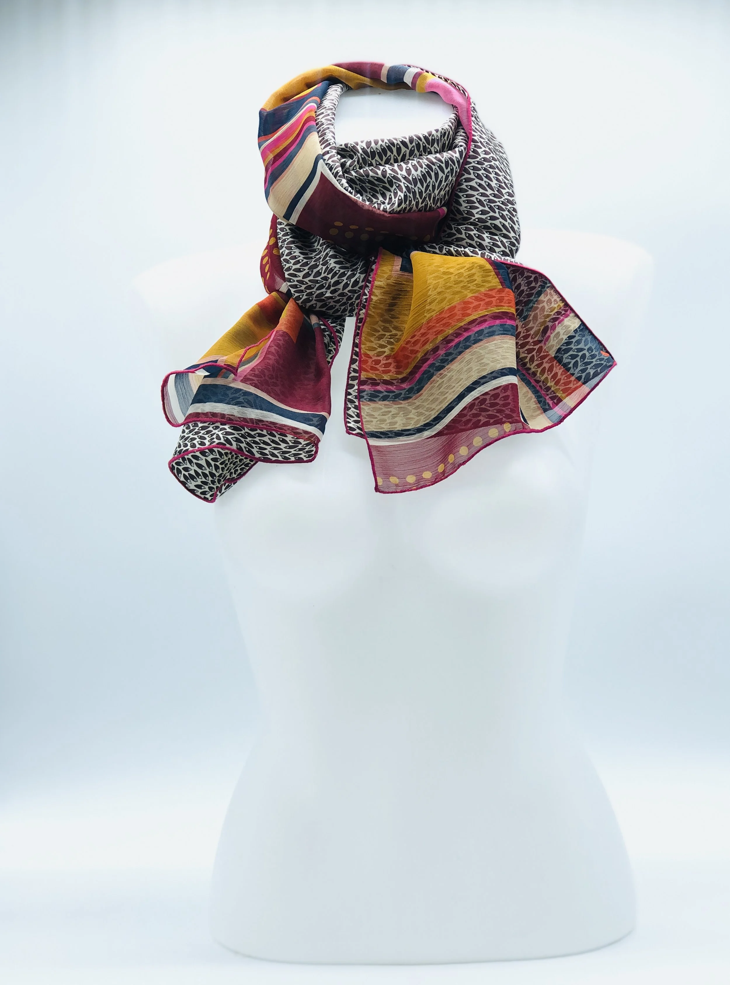 Le foulard Duo est composé de deux matières et deux motifs. Il mesure 1m40 sur 45 cm. Il est en viscose et voile de coton.